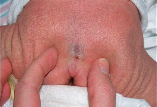 In a study published in the journal Archives of Childhood Diseases, dents with this feature were six times more likely to be associated with spinal cord problems than indentations alone.