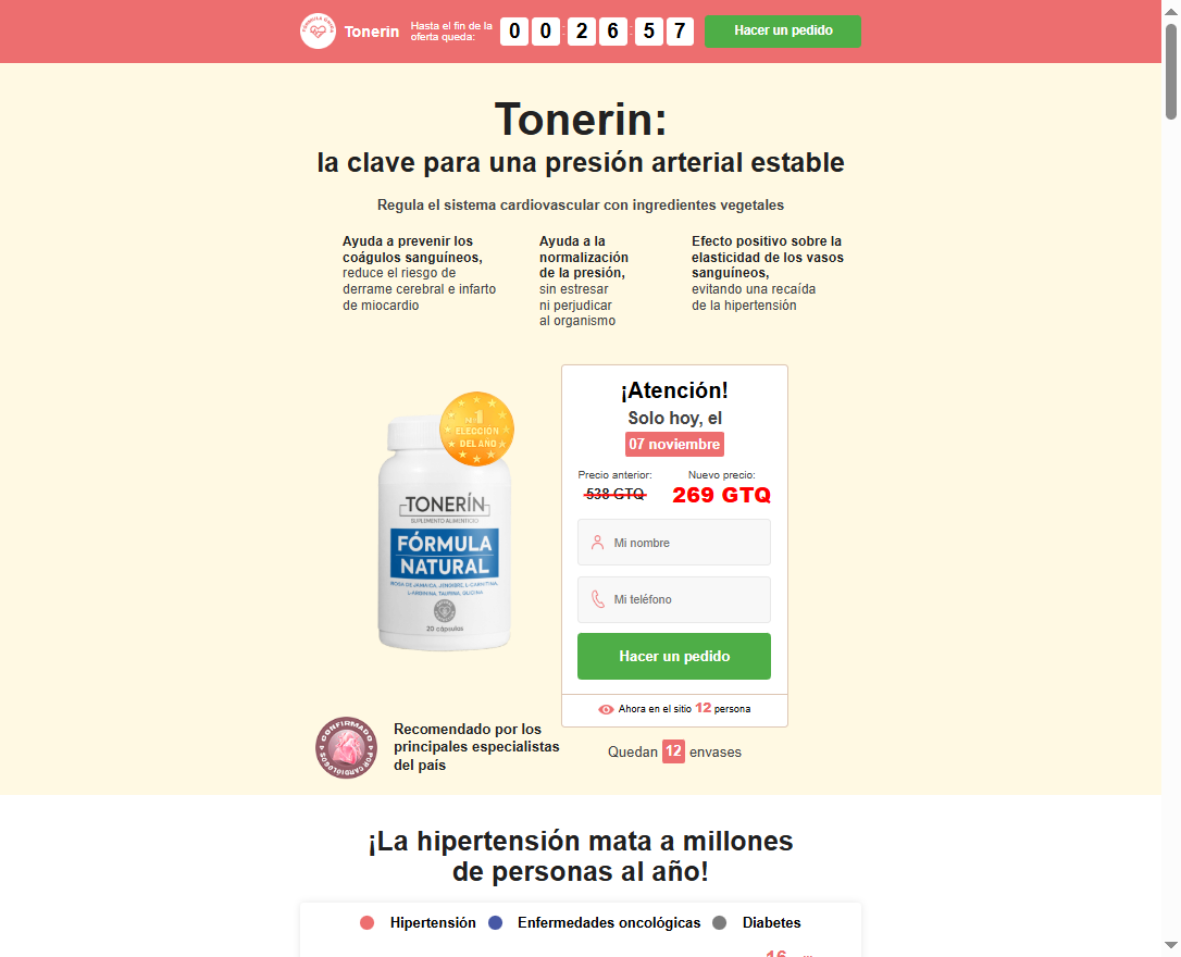 En Guatemala, la salud cardiovascular es un tema de creciente preocupación, y Tonerin se ha convertido en una solución natural y efectiva para muchos. Con una descuento del 50% disponible exclusivamente en el mercado local, este suplemento promete resultados notables en el control de la presión arterial y el bienestar general. Si estás buscando una forma segura de mejorar tu salud, este artículo te explica todo sobre Tonerin en Guatemala, sus beneficios y las experiencias de usuarios reales. 🩺